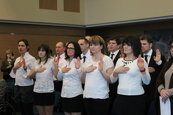 Szekeres Pál az Emberi Erőforrások Minisztériumának miniszteri biztosa, Fábián László a Magyar Olimpiai Bizottság Igazgatója, Deutsch Tamás a Magyar Paralimpiai Bizottság alelnöke közreműködésével került sor a magyar hallássérültek Téli Siketlimpiára utazó válogatottjának eskütételére, ahol köszöntések mellett Orbán Viktor miniszterelnök úr „útravalóját” dr. Tapolczai Gergely, a Magyar Hallássérültek Sportszövetségének elnöke jelnyelven tolmácsolta. Az eskütétel szövegét Bajuszné Pintér Katalin és Kacsinkó Adrián Gábor mondta el. Ezután Nyírő Zsolt, a Magyar Hallássérültek Sportszövetségének ügyvezető elnöke szólt néhány biztató szót a jelenlévő sportolókhoz és vendégekhez. Többek közt elmondta, hogy történelmi pillanat előtt áll a magyar siketsport, ugyanis a 18. alkalommal megrendezésre kerülő téli siketlimpia az első, amelyen Magyarország is képviselteti magát. Urr Anita, az MHSSZ főtitkára moderálta a rendezvényt, az ő zárszavával ért véget a siketlimpiai eskütétel, melyet szerény állófogadás követett. A 18. Siketlimpiával kapcsolatos sajtóanyag letölthető: itt Ezzel kapcsolatos hírek linkjei: http://www.zetapress.hu/sport/57989 http://sportmenu.net/fogadalmat-tettek-a-teli-siketlimpiara-utazo-magyar-versenyzok/ http://c36.hu/2015/03/fogadalmat-tettek-a-teli-siketlimpiara-utazo-magyar-versenyzok/ http://webradio.hu/hirek/sport/fogadalmat_tettek_a_teli_siketlimpiara_utazo_magyar_versenyzok http://sportgeza.hu/parasport/2015/03/13/fogadalmat_tettek_a_teli_siketlimpiara_utazo_magyar_versenyzok/ http://www.mob.hu/eskut-tett-a-18-teli-siketlimpiara-keszulo-magyar-csapat